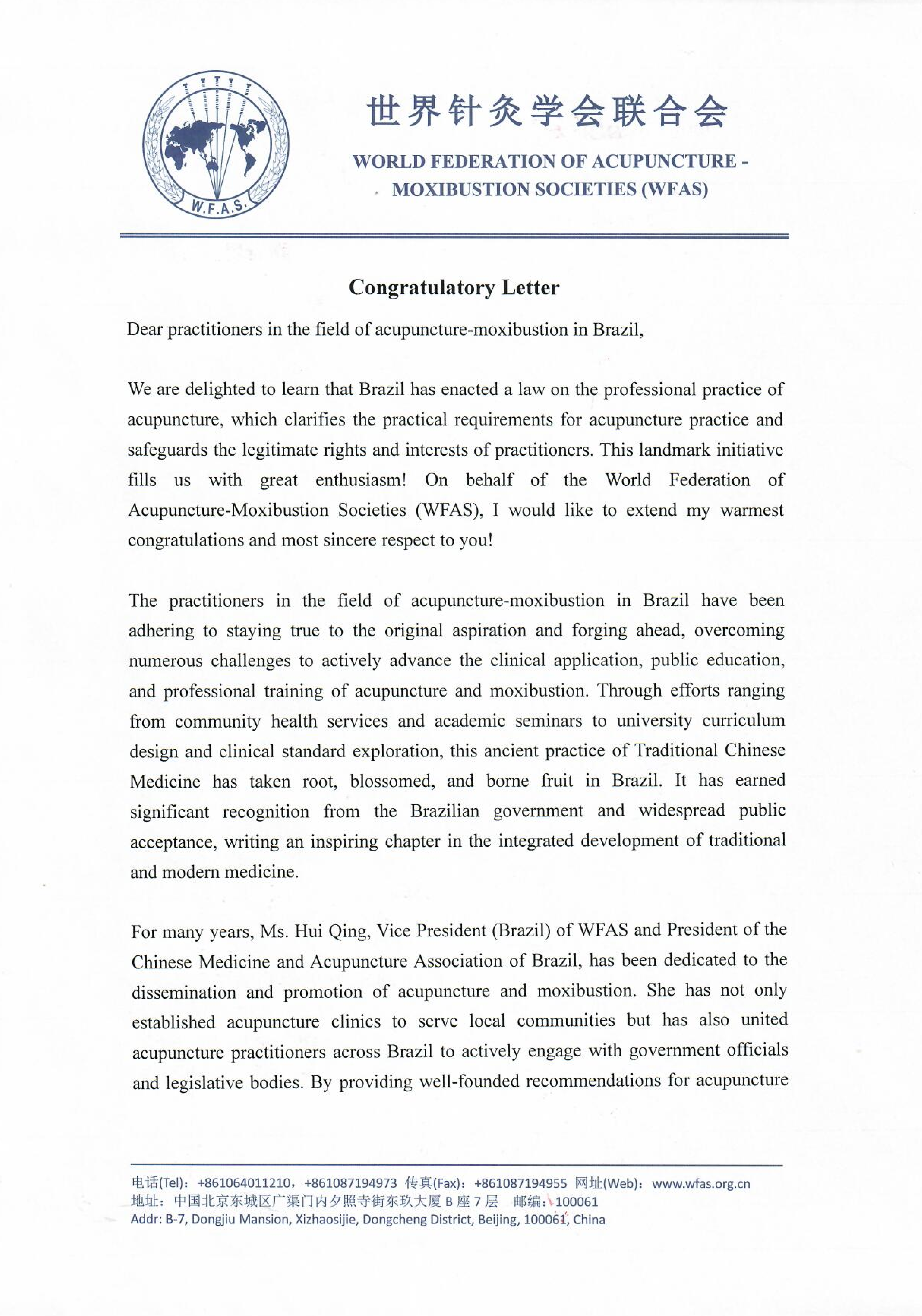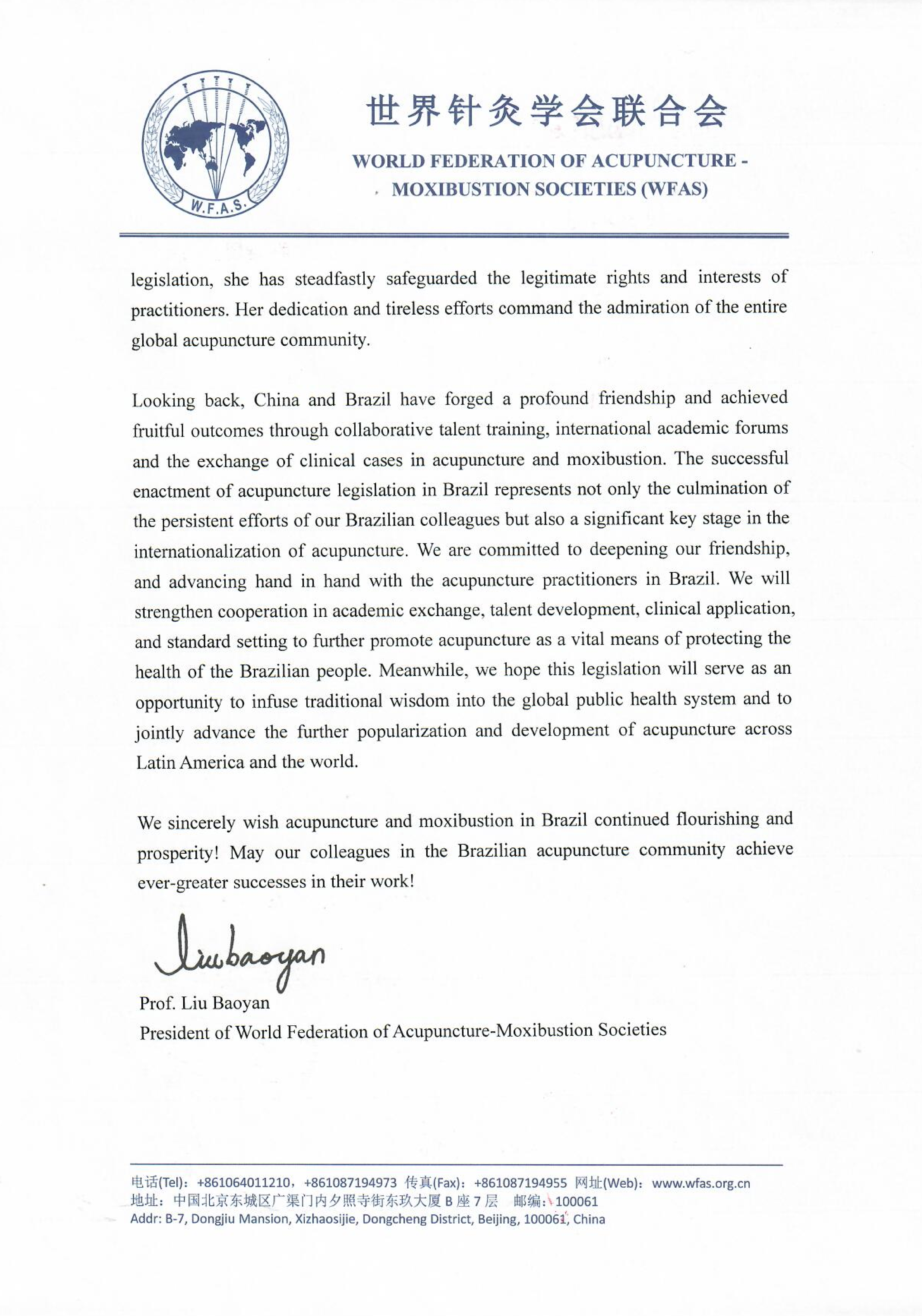 Congratulatory Letter from President Liu Baoyan to the practitioners in the field of acupuncture-moxibustion in Brazil